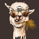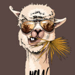 Fototapeten Ein Lama trägt eine Sonnenbrille und frisst ein Blatt