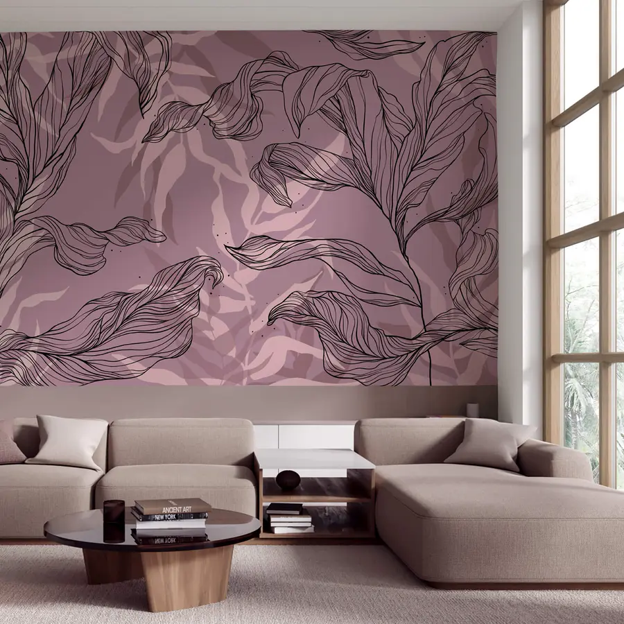 Fototapeten Zeichnung von Blättern auf einem lila Hintergrund