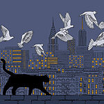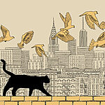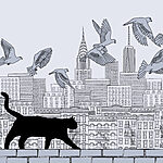 Fototapeten Katze, die auf einer Mauer läuft, während am Himmel Vögel fliegen