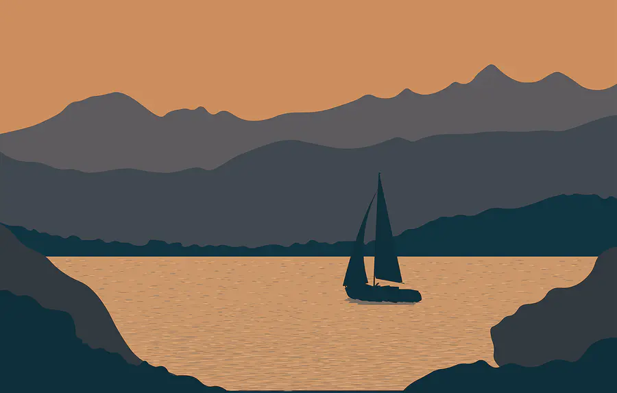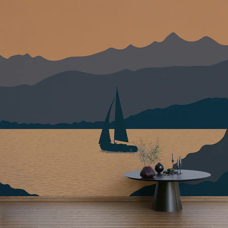 Fototapeten Segelboot auf dem Wasser mit Bergen im Hintergrund