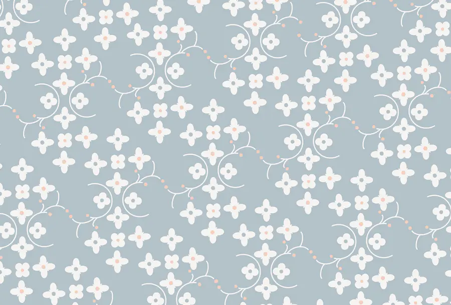 Fototapeten Muster aus weißen Blumen und rosa Punkten auf blauem Hintergrund