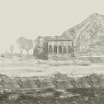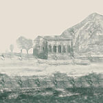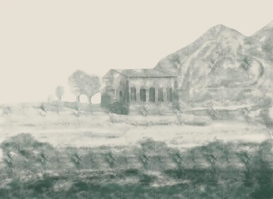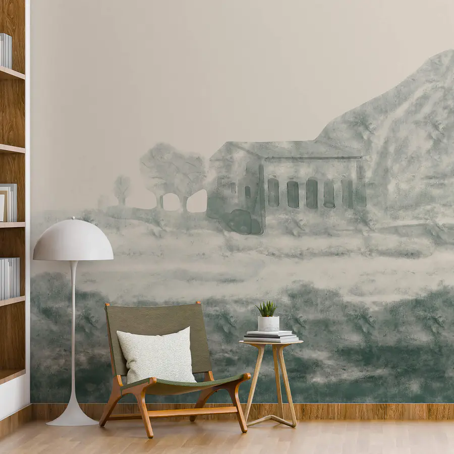 Fototapeten Gemälde eines Gebäudes und eines Berges