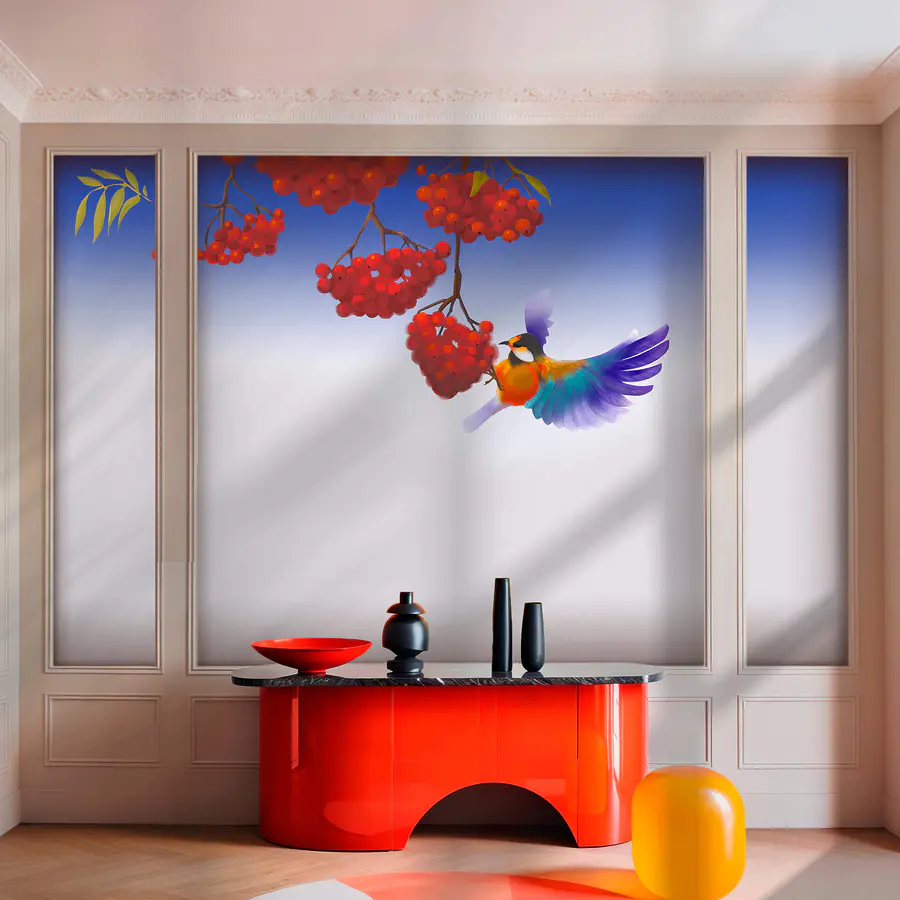 Fototapeten Vogel, der eine Handvoll rote Beeren frisst