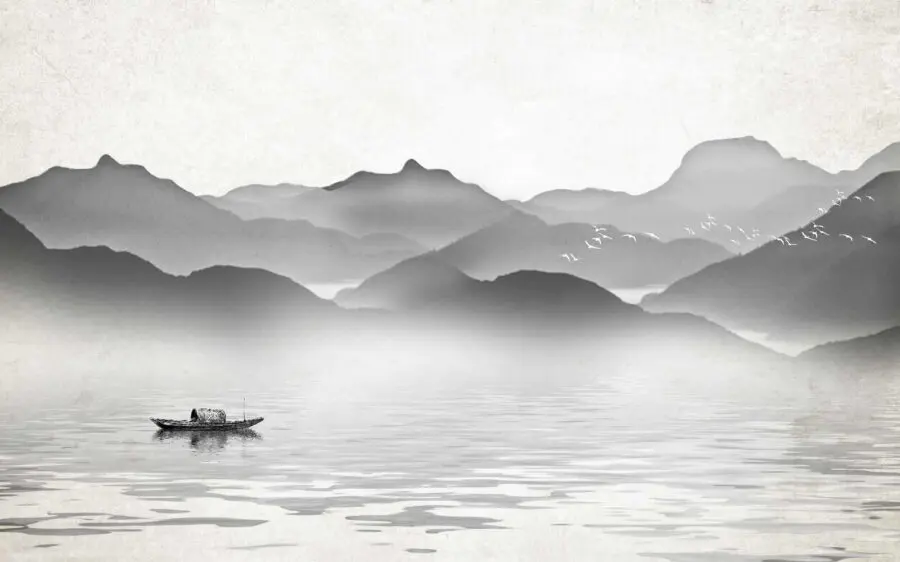 Fototapeten Boot auf dem Wasser mit Bergen im Hintergrund