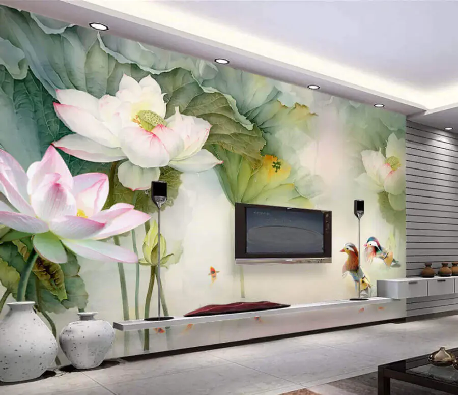 Fototapeten Gemälde einer Ente, die in einem Teich mit Blumen schwimmt