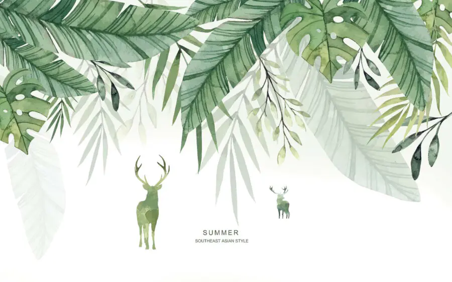 Fototapeten Aquarellmalerei eines Rehs und Blätter