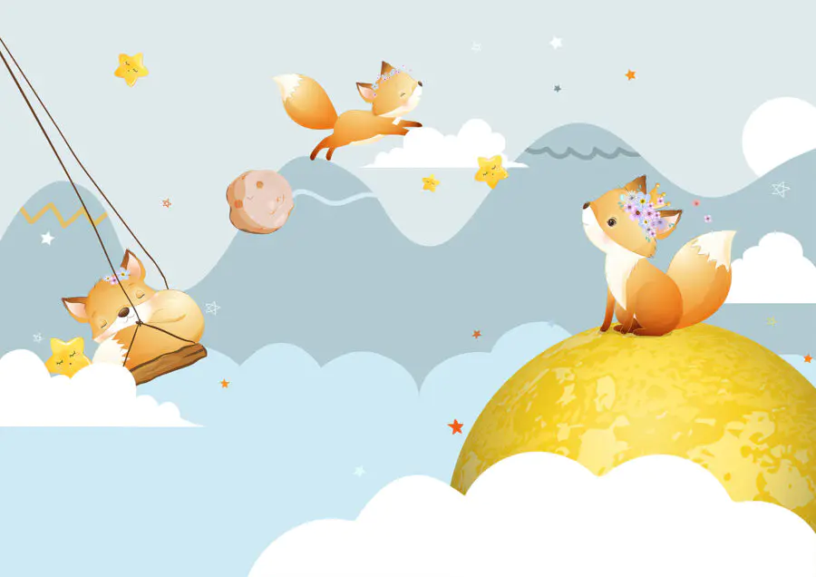 Fototapeten Cartoon von Füchsen auf einem Mond
