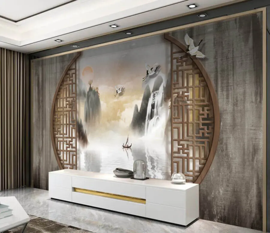 15.51 €9.31 €Fototapeten Gemälde einer Landschaft mit Kränen, die über ein Gebäude fliegen