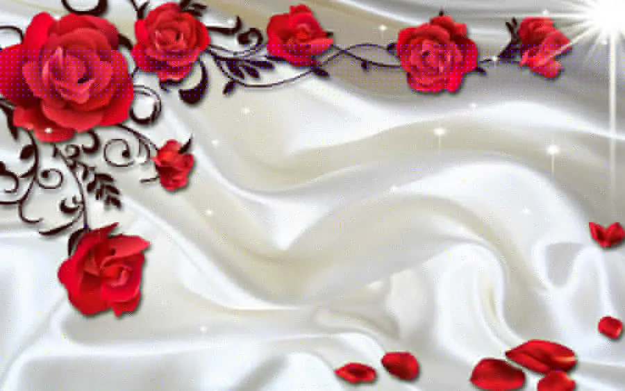 Fototapeten Weißer Satin mit roten Rosen und Blütenblättern