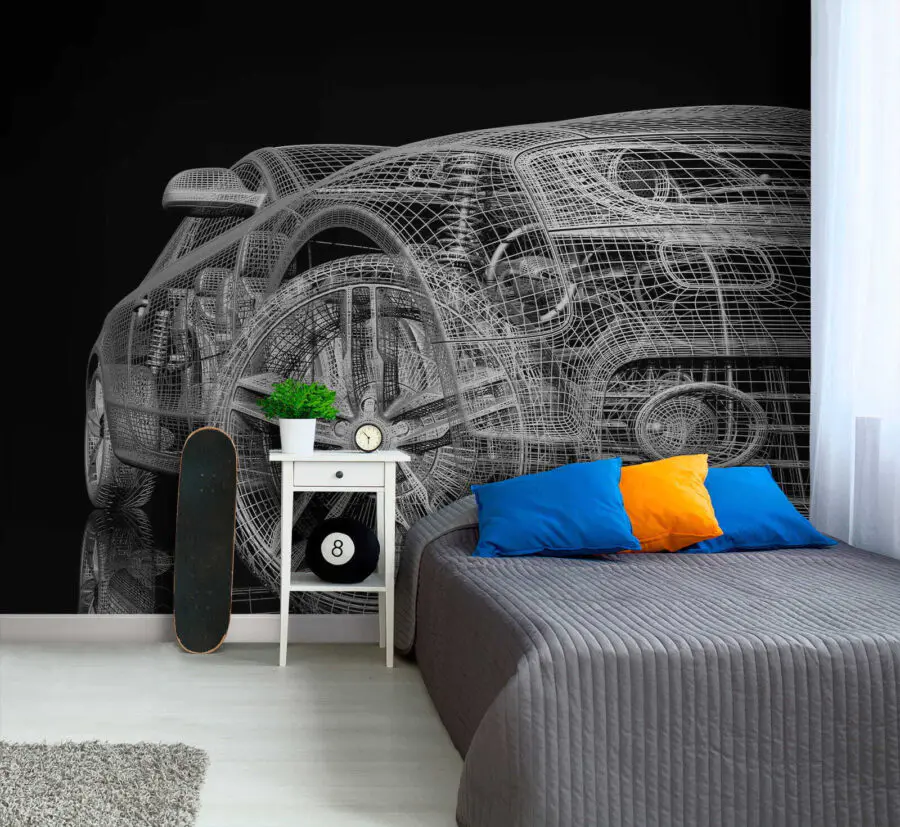 Sehen Sie sich diese coole Fototapete an, die jeden Raum verändern wird. Stellen Sie sich das vor - ein schnittiges Automodell, dessen kompliziertes Drahtgitter vor einem schwarzen Hintergrund leuchtet, direkt in Ihrem Wohnbereich. Es ist wie ein Stück futuristische Kunst, perfekt für Autoliebhaber, Design-Enthusiasten oder sogar Kinder, die Autos für den Hit halten. Es sorgt nicht nur für ein technisches Flair, sondern weckt auch die Neugierde - fast so, als könnten sie die virtuellen Zahnräder anfassen. Es ist mehr als nur Dekoration; es ist ein Gesprächsanlass, ein Katalysator für Tagträume und vielleicht sogar eine Motivation, endlich zu lernen, wie Autos funktionieren. Perfekt für ein Arbeitszimmer, ein Spielzimmer oder die leere Wand, die du schon lange aufpeppen wolltest. Dieses Wandbild steht nicht einfach nur so da - es beflügelt die Fantasie und hebt die Atmosphäre auf ein neues Niveau!