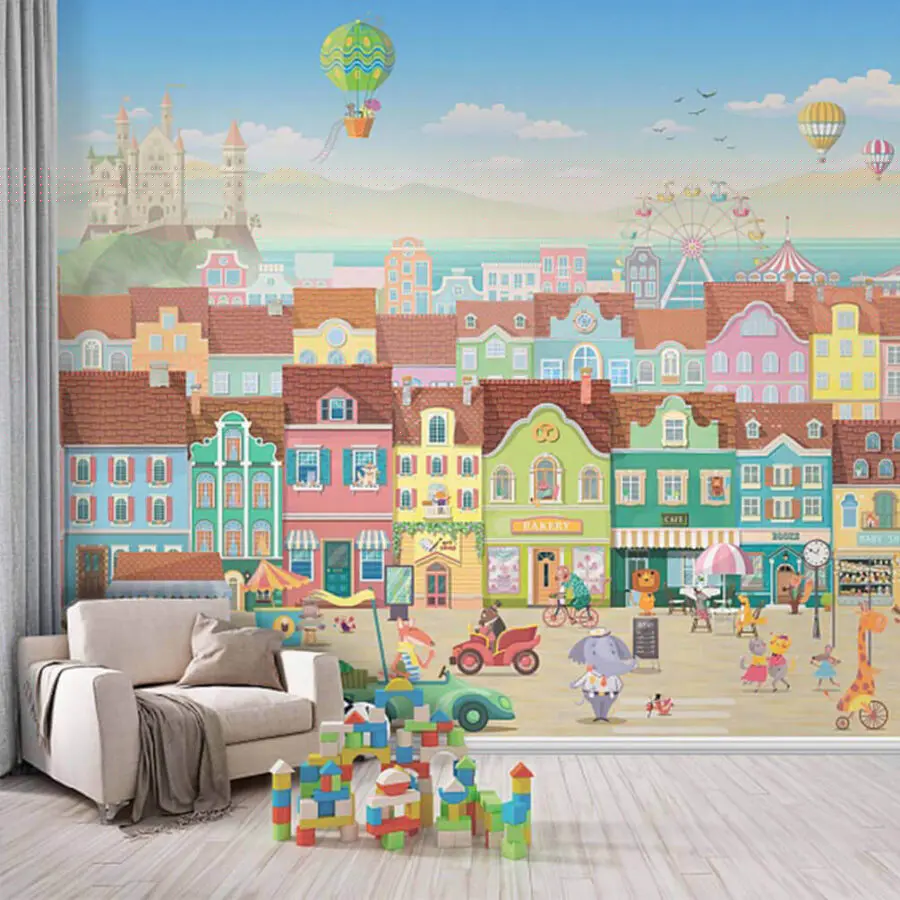 Fototapeten Cartoon-Stadt mit vielen Gebäuden und einem Riesenrad