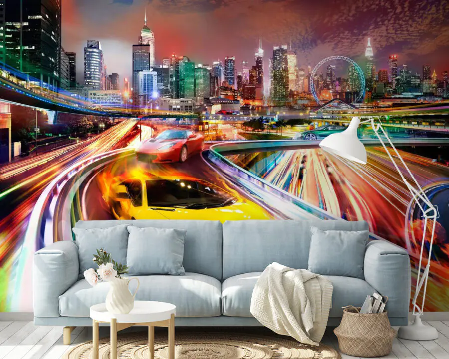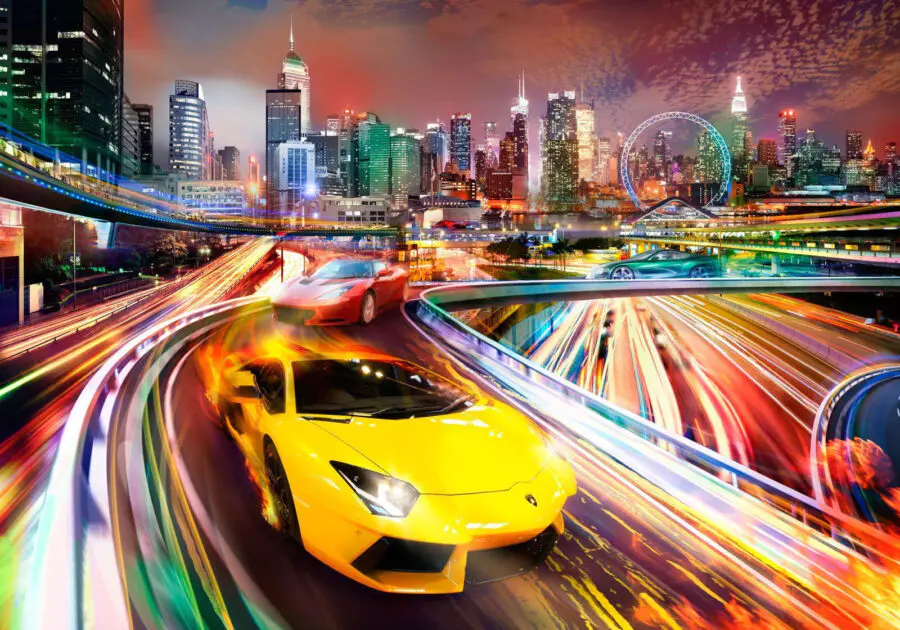 Fototapeten Gelbe und rote Sportwagen auf einer Straße mit einer Stadt im Hintergrund