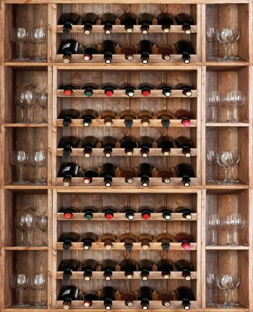 Fototapeten Weinflaschen und Gläser in einem Regal