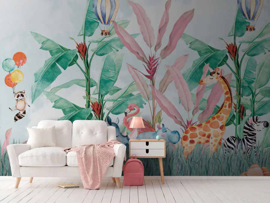 Stellen Sie sich vor, Sie betreten einen Raum und werden von dieser entzückenden Szene begrüßt - es ist, als würden Sie direkt von zu Hause aus auf eine spielerische Safari gehen! Dieses Wandbild "Eine Gruppe von Tieren auf einer Wiese" ist voller liebenswerter Charaktere - schläfrige Nilpferde, ein wildes (und doch freundliches) Nashorn, eine anmutige Giraffe, ein Zebra, ein schrulliger kleiner Waschbär mit Luftballons, und verpassen Sie nicht die charmanten Heißluftballons über Ihnen! Das üppige Grün und die skurrilen Elemente machen es zu einer perfekten Ergänzung für Ihr Kinderzimmer oder das Spielzimmer Ihres Kindes. Stellen Sie sich eine Märchenstunde inmitten dieser lebhaften, farbenfrohen Truppe vor - eine magische Kulisse, die Fantasie und Kichern anregt. Sogar Erwachsene könnten sich dabei ertappen, wie sie von Heißluftballonfahrten und Nashornkuscheln träumen... Dieses Wandbild ist nicht nur für Kinder, sondern für jeden, der ein bisschen mehr Laune in seinem Leben braucht. Es ist so niedlich, dass es dich jeden Tag zum Lächeln bringen wird!