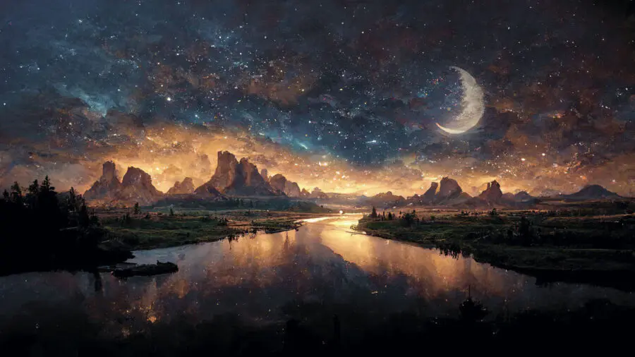 Fototapeten Fluss mit einem Mond am Himmel