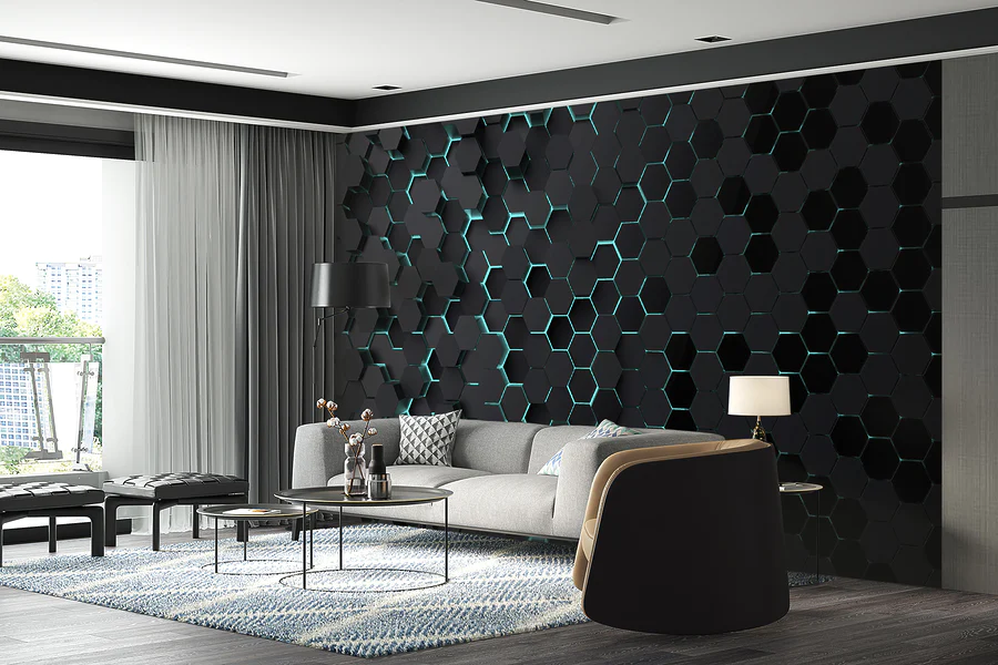 Fototapeten Schwarze Sechsecke mit blauen Lichtern