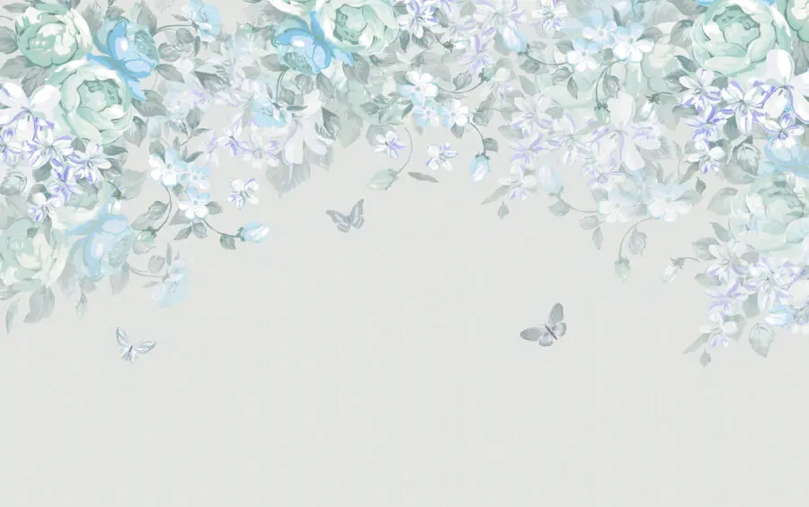 Fototapeten Eine weiße und blaue Blumen und Schmetterlinge