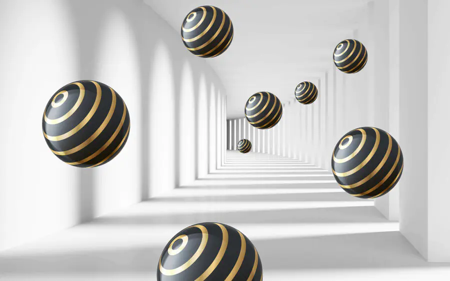 Fototapeten Gestreifte Kugeln schweben im weißen Korridor