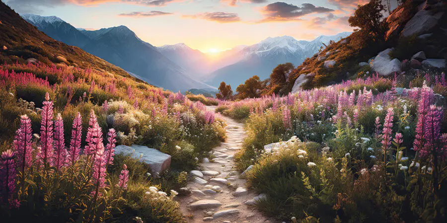 15.51 €9.31 €Fototapeten Weg durch ein Tal mit Blumen und Bergen im Hintergrund