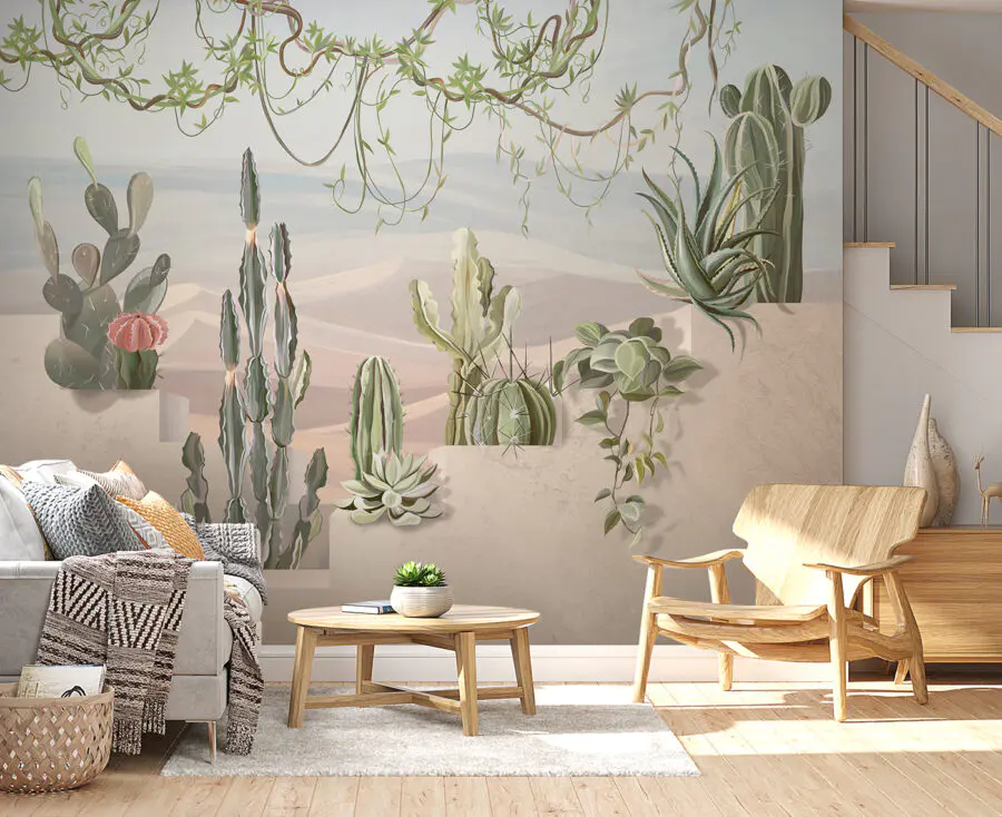 Fototapeten Wandmalerei mit Kakteen und Sukkulenten
