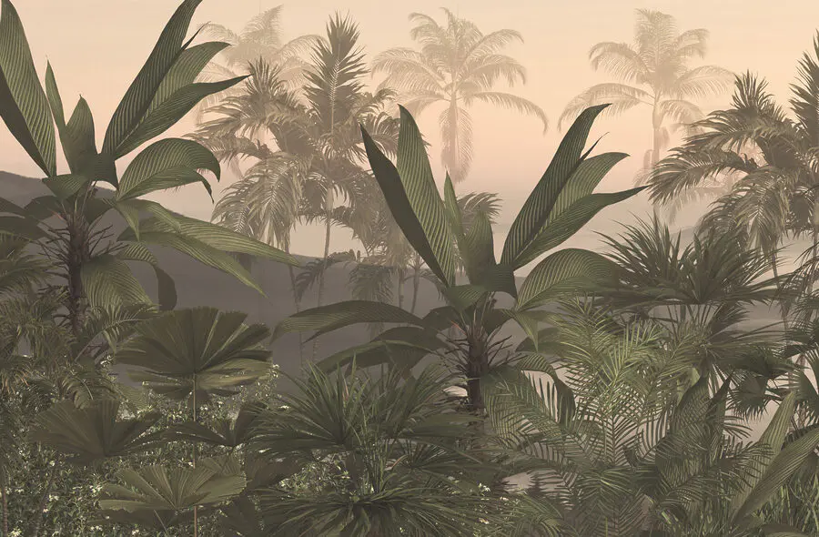 Fototapeten Eine Gruppe von Palmen in einem nebligen Wald