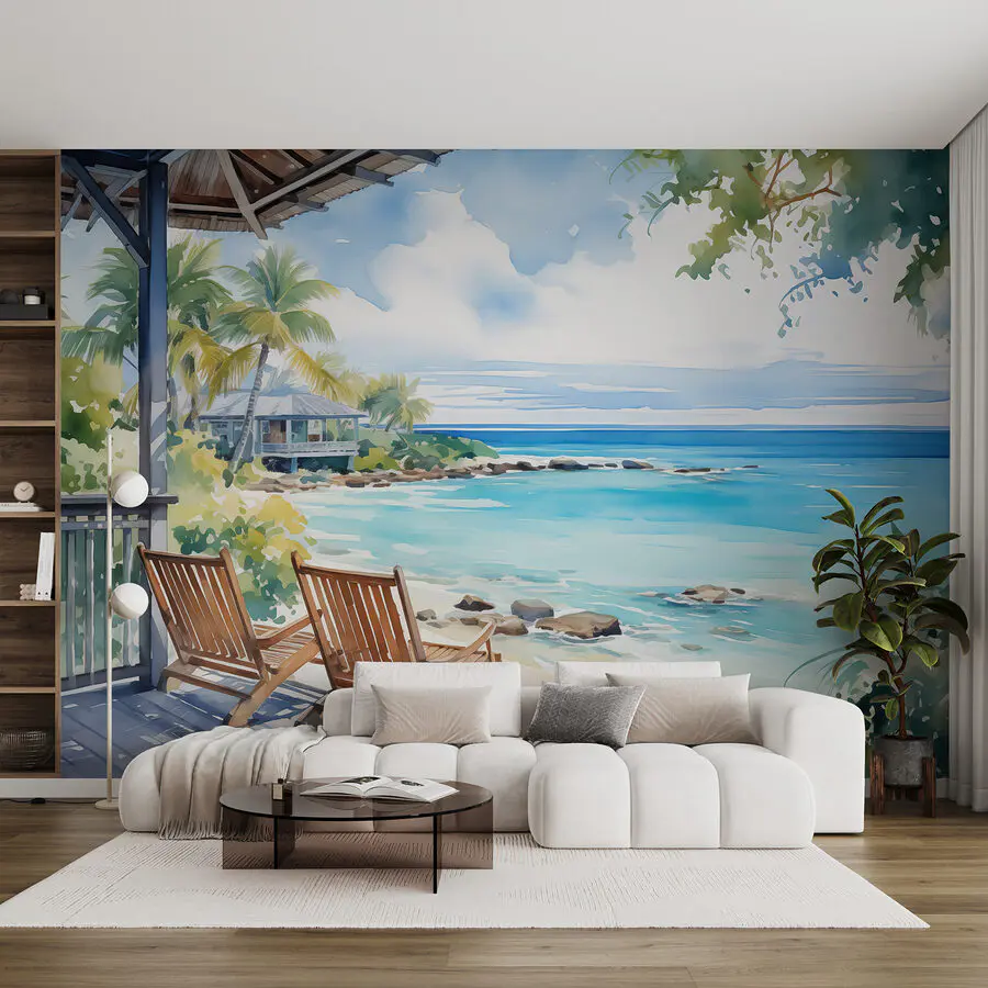 Fototapeten Aquarell von Stühlen auf einer Terrasse mit Blick auf einen Strand