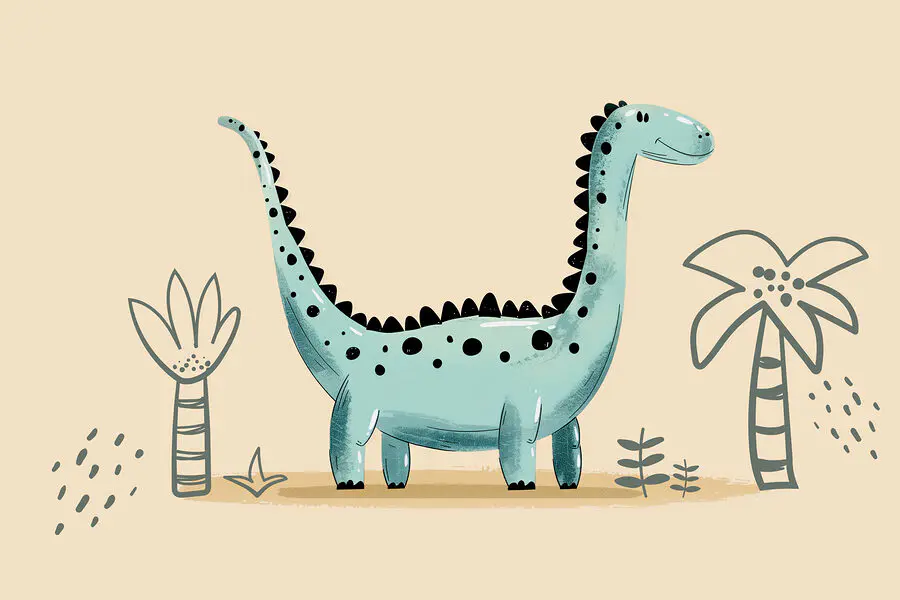 Fototapeten Cartoon Dinosaurier mit Pflanzen und Blättern