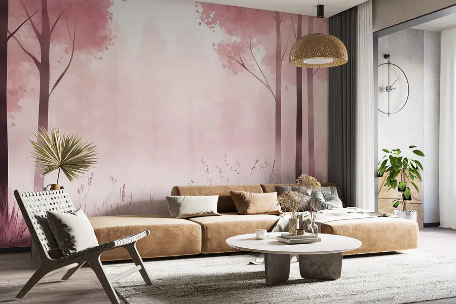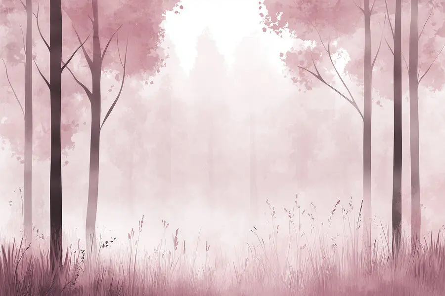 Fototapeten Nebliger Wald mit rosa Bäumen