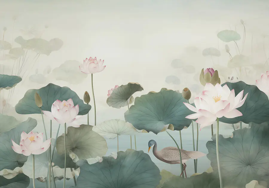 Fototapeten Ente in einem Teich mit Lotosblumen