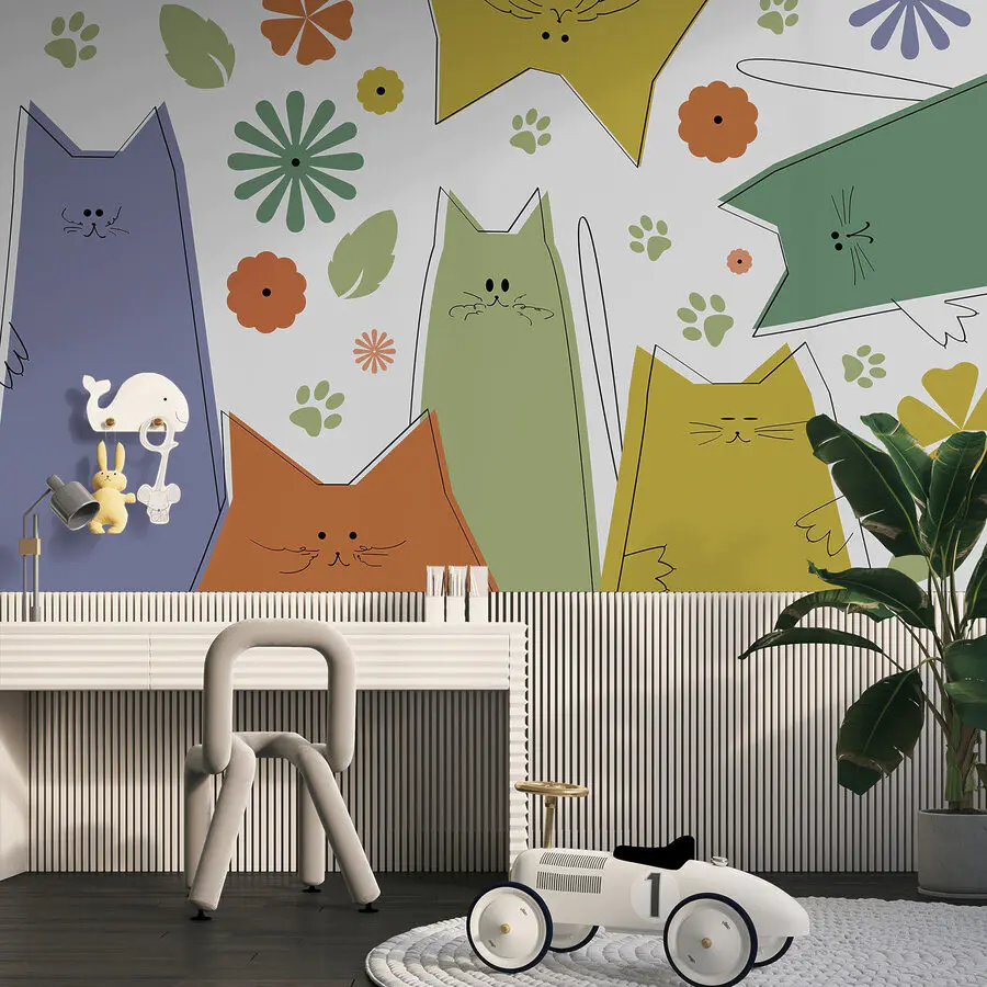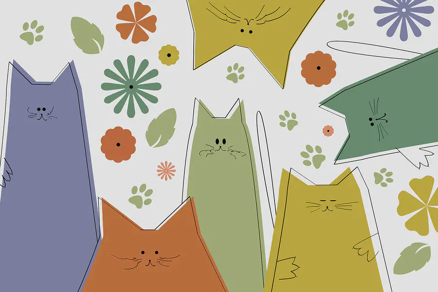 Fototapeten Gruppe von Katzen mit Blumen und Blättern