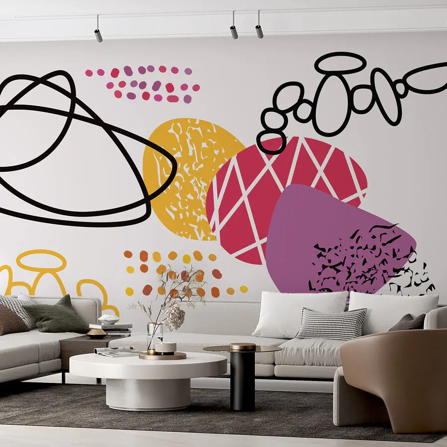 Die Umgestaltung eines Raums muss nicht immer eine ernste Angelegenheit sein. Hier kommt das Wandbild "Colorful Shapes and Dots", eine verspielte Explosion von Farben und Formen, die jede Wand sofort aufpeppt. Stellen Sie sich vor, Sie betreten einen Raum, in dem leuchtende Farben vor Ihren Augen tanzen - es ist wie eine Party für Ihre Wände! Das lustige, abstrakte Design wirkt fast wie eine spontane Kritzelei, die fabelhaft gelungen ist. Stellen Sie sich vor, wie diese Fototapete eine gemütliche Leseecke erhellt oder ein minimalistisches Büro aufpeppt. Es bringt die perfekte Mischung aus Kreativität und Fröhlichkeit, die selbst die trübsten Tage ein wenig heller macht. Wer hätte nicht gerne einen Spritzer Freude an seinen Wänden? Lassen Sie die guten Schwingungen los!