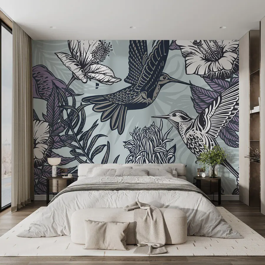 Fototapeten Vogel fliegt neben den Blumen