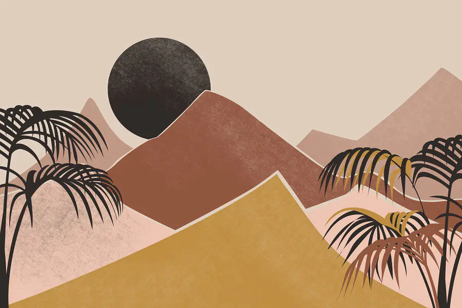 Fototapeten Landschaft mit Palmen und Bergen