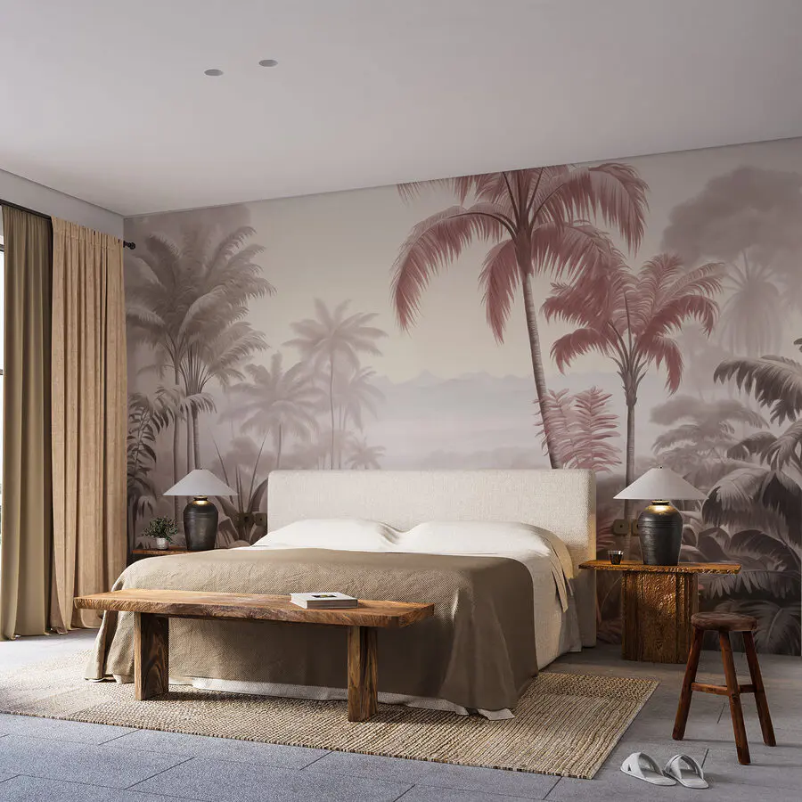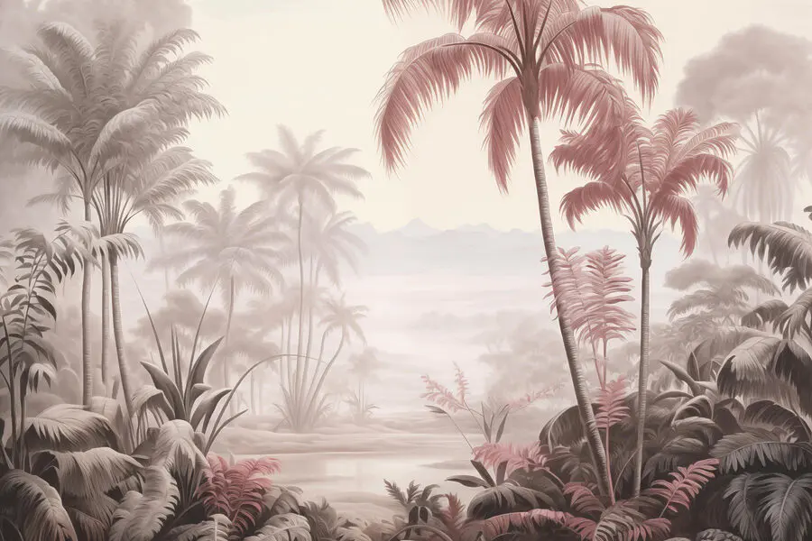 Mit dieser Fototapete mit einer ruhigen Palmen- und Berglandschaft verwandeln Sie jeden Raum in einen Traum. Stellen Sie sich vor, Sie nippen an einem Kokosnussgetränk (mit oder ohne Rum) und blicken dabei auf üppiges Grün und sanfte, neblige Gipfel. Dieses Wandbild strahlt Ruhe aus und eignet sich perfekt für eine gemütliche Sitzecke oder ein lichtdurchflutetes Wohnzimmer. Die sanften Farbtöne schaffen eine einladende Atmosphäre, ideal zum Träumen oder um nach einem langen Tag zu entspannen. Es ist, als würde man sich ein Stück Tropen in die eigenen vier Wände holen, nur ohne den Sand in den Schuhen. Wer hätte gedacht, dass Wandkunst so entspannend sein kann?