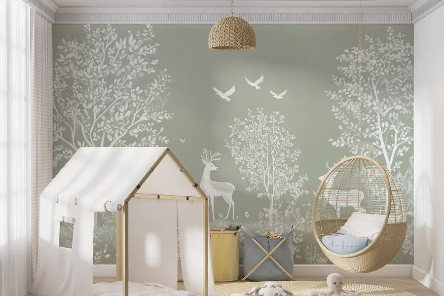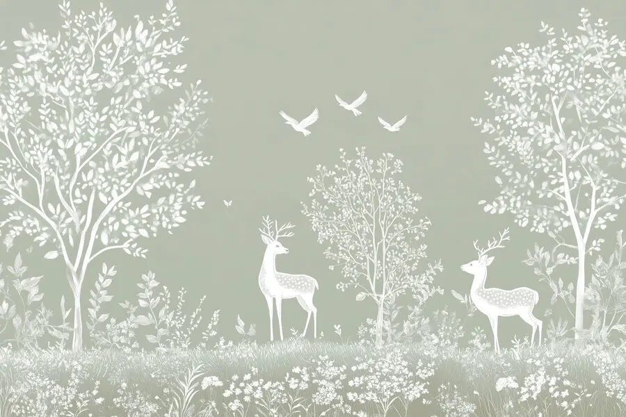 Fototapeten Weiße Hirsche und Vögel im Wald