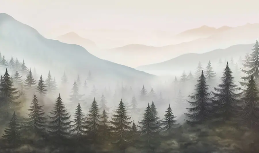 Fototapeten Neblige Landschaft mit Bäumen und Bergen