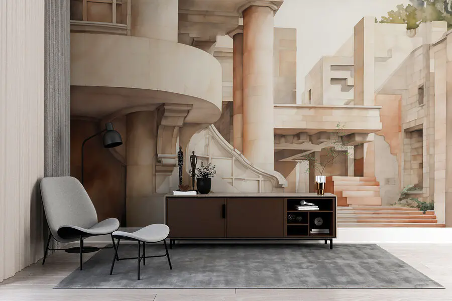 Fototapeten Gemälde eines Gebäudes mit Treppen und Stufen