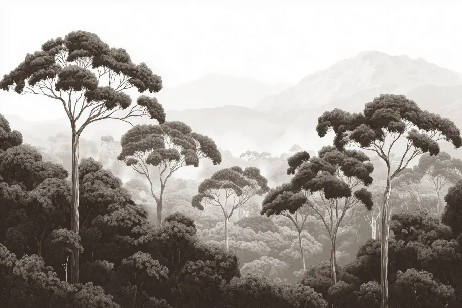 Fototapeten Wald mit Bäumen und Bergen im Hintergrund