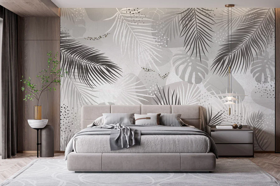 Fototapeten Grauer und weißer Hintergrund mit Blättern