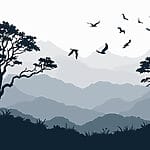 Fototapeten Vögel fliegen über eine Bergkette
