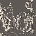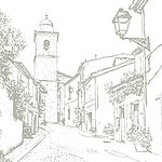Fototapeten Zeichnung einer Straße mit Gebäuden und einem Glockenturm