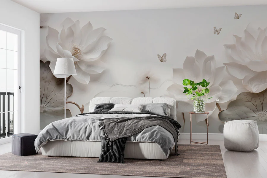 Fototapeten Weiße Papierblumen und Schmetterlinge auf einer weißen Fläche