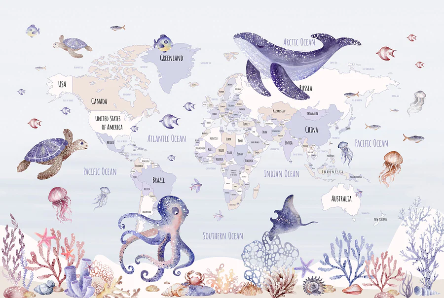 Fototapeten Weltkarte mit Meerestieren
