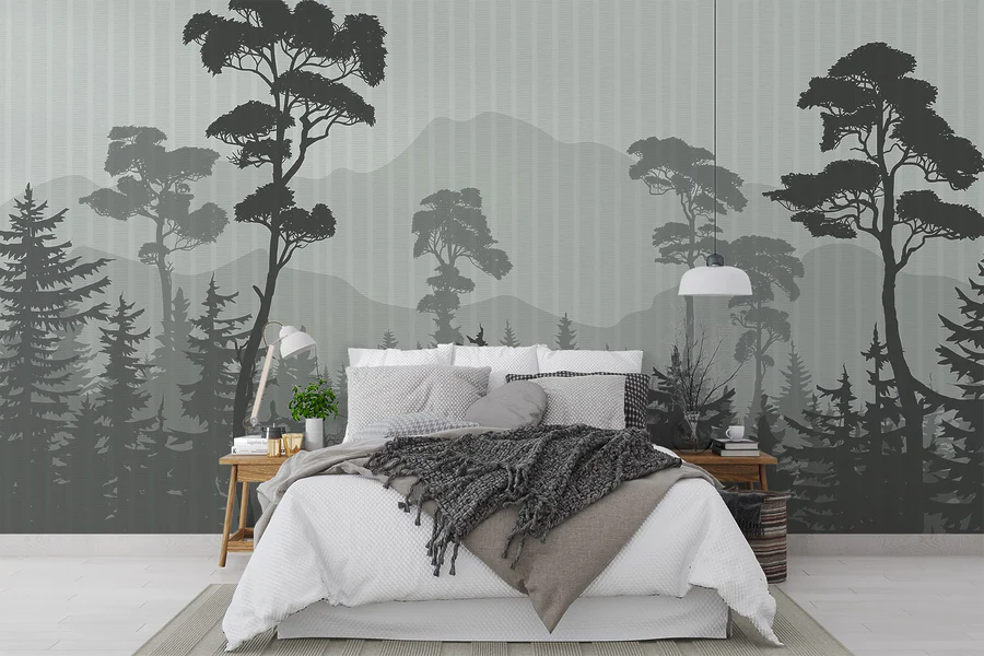 Fototapeten Wald mit Bergen und Bäumen