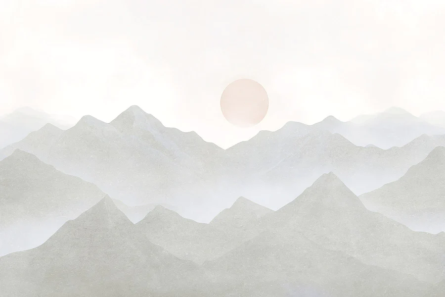 Fototapeten Gebirge mit der Sonne in der Ferne
