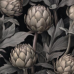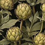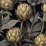 Fototapeten Artischocken und Blätter auf einem schwarzen Hintergrund