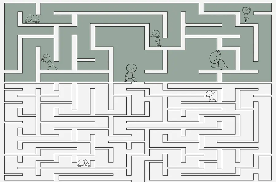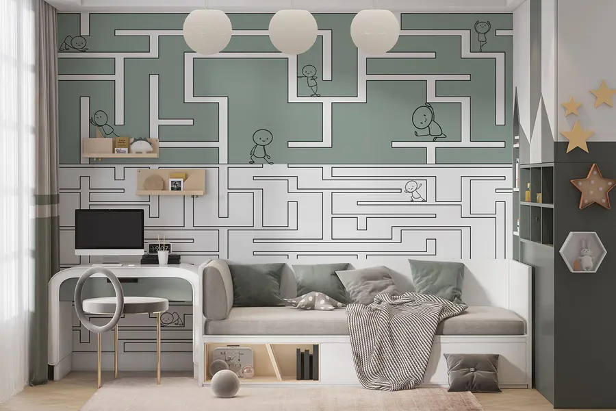 Fototapeten Labyrinthspiel mit Zeichentrickfiguren, die durch das Labyrinth laufen