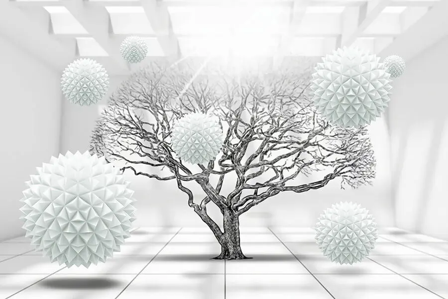 Wandbilder Baum mit weißen Kugeln, die in der Luft schweben