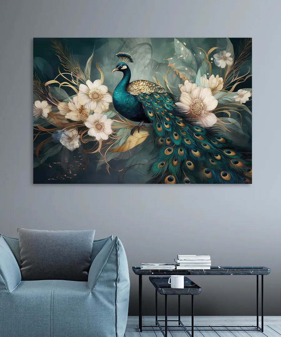 Wandbilder Ein Pfau sitzt auf einem Zweig mit Blumen
