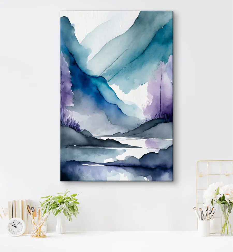 Wandbilder Aquarell von Bergen, Bäumen und einem Fluss